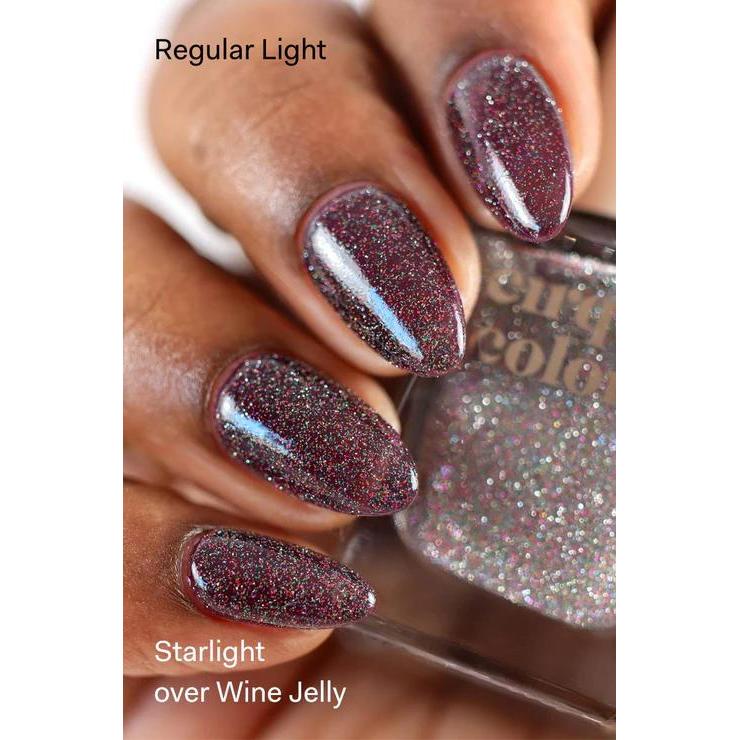 Starlight is a rainbow flash reflective nail polish topper in a clear base. Starlight contains special glitter particles that bounce back direct light (such as sunlight or strong indoor bulbs) for an intense sparkle effect.