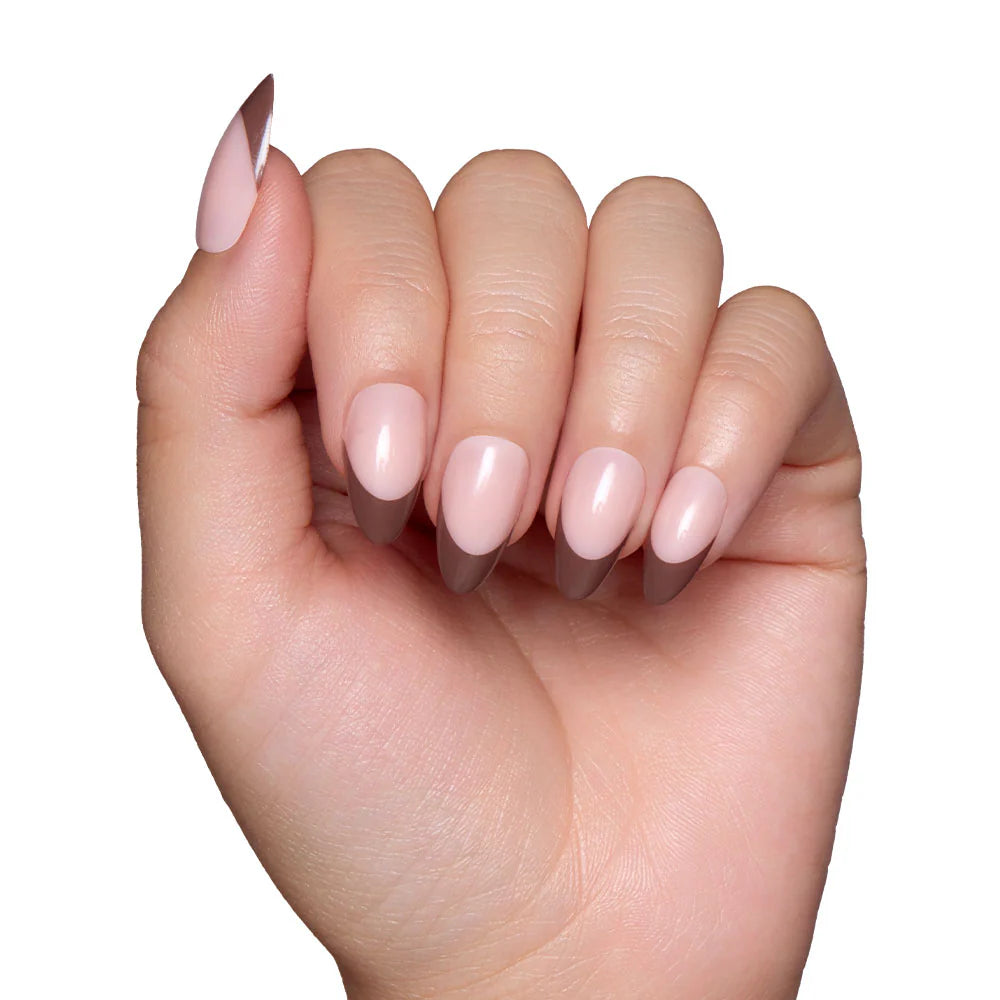 Indulge in the rich elegance of Chocolate. With a deep brown French tip on a semi-translucent base, these short almond nails add a touch of sophistication to every gesture. A must-have for lovers of warm, earthy tones to instantly upgrade your at-home mani.