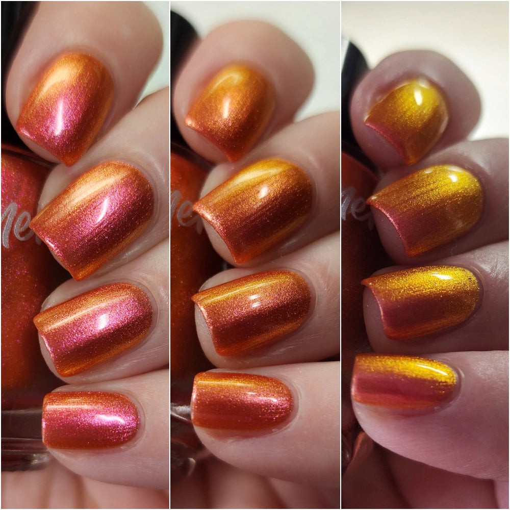 I Lily Love It is a warm-toned multichrome nail polish perfect for spring and summer. The coral-leaning pink base quickly shifts to rich hues of orange and gold. Sunlight or bright light enhances the pink tones and rusty orange shades. With two-coat coverage, this cheerful polish is a perfect warm-weather manicure.